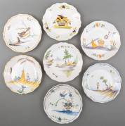 Zeven Frans aardewerk borden met gecontourneerde rand en diverse polychrome decors, tweede helft 18e eeuw -randdefecten-, 3 x Ø 22 cm