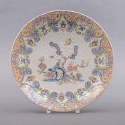 Aardewerk schotel met polychroom chinoiseriedecor: hanen en hennen in tuin, omgeven door bloemenrand, vermoedelijk 18e eeuw, Delft of Dèvres -restauraties-, 5 x Ø 33,5 cm