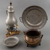 Bronzen grape met koperen hengsel, staand op drie pootjes, 17e eeuw, daarbij: tinnen kraankan -defecten, gedeukt-, tinnen papbordje en diepe tinnen schaal met twee hengsels, 44 x Ø 26 cm