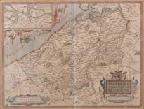 Ingekleurde gravure Vlaanderen: 'Flandriae Comitatus Descripto', uitgegeven door Gerard Mercator en Ortelius, gedateerd 1590, 38 x 80 cm