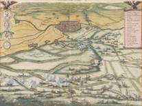 Ingekleurde gravure Leiden: ''T Ontzet van Leyden 1574', in vogelvluchtperspectief, uitgegeven tussen 1679 en 1684, 25,5 x 34,5 cm
