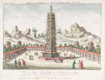Ingekleurde gravure China: 'Vue de tour porcelaine à Nanking en Chine', door Franz Xaver Habermann (1721-1796) naar Johan Nieuhof (1618-1672) -onderaan in handschrift Nederlandse beschrijving toegevoegd-, 35 x 46 cm