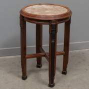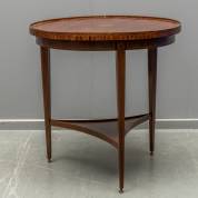 Rond mahonie tafeltje met opstaande rand en marqueterie in het blad, de drie poten verbonden door etagère, Louis Seize-stijl, tweede helft 19e eeuw -opstaand randje beetje los-, 63 × Ø 62 cm