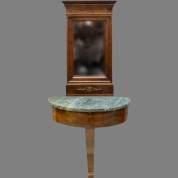 Halvemaan wandtafeltje met grijs marmeren blad en mahonie onderstel, met bijpassend spiegeltje, Hollands, biedermeier -fineerschades-, maat tafeltje 72 × 62 × 37 cm