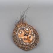 Beschilderd masker van schildpadschild met schelpen, veren en riet, Papoea-Nieuw-Guinea, 28 × 24 cm