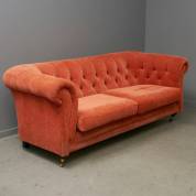 Oranjerood gestoffeerde tweezitsbank met gecapitonneerde rugleuning, de pootjes op wieltjes, 20e eeuw -gebruikssporen-, 75 × 195 × 92 cm