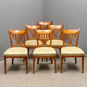 Zes iepen stoelen met gecanneleerde poten, lichtgroene bekleding en vaasvormige spijlen in de rug, eerste helft 19e eeuw, hoogte 90 cm