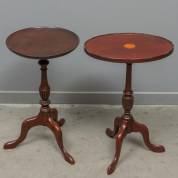 Twee kleine mahonie bijzettafeltjes, waarvan één met ingelegd ornament in het ovale blad, 20e eeuw, beide 52 cm hoog