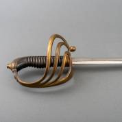 Stalen sabel met messing gevest en geribbeld zwart houten handvat in stalen schede, niet gemerkt, eind 19e eeuw -gebruikssporen-, lengte 109 cm