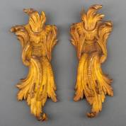 Paar goudkleurige gesneden houten ornamenten, rococo -bij beide klein stukje afgebroken-, 34 cm