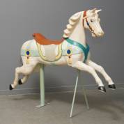 Polychroom beschilderd houten carrouselpaard met glazen ogen en paardenharen staart, op metalen onderstel, 20e eeuw -gebruikssporen-, 115 × 138 × 30 cm