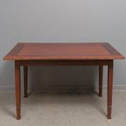 Mahonie tafel met coromandel rand in het blad, de bladrand en poten met profileringen, ontwerp Jan Nagelvoort, uitvoering 't Binnenhuis, gemonogrammeerd met brandmerk en gemerkt met plaatje onder blad, eerste kwart 20e eeuw, 75 × 130 × 80 cm