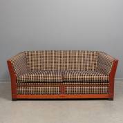 Bubinga bank met gezwarte accenten en geblokte bekleding, model Lawrence, serie Decoforma, uitvoering Schuitema, 81 × 184 × 72 cm