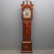 Iers staand horloge in mahonie kast, de kap bekroond door gebroken fronton met bronzen ornament in de vorm van een adelaar, de messing wijzerplaat met verzilverde cijferring, verguld metalen hoekstukken, seconde-, minuut-, uur-, dag-, datum- en maanaanduiding, slagwerk op enkele bel, gesigneerd: Francis Kerr, Loughgall, werkzaam rond 1770-1784 -enkele defecten aan fineer-