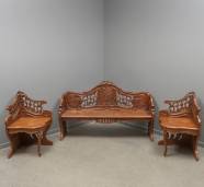 Eiken halbank met twee bijbehorende hoekstoelen, het decor met ranken en centraal een cornucopia, neo-rococo -kuif defect, kleine defecten-, afmetingen bank 93 × 152 × 39 cm, hoekstoelen 85 × 50 × 50 cm