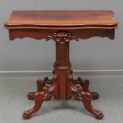 Mahonie speeltafel met gecontourneerd blad, staand op bolklauwpoten, tweede helft 19e eeuw -gebruikssporen-, 79 × 83 × 42 cm
