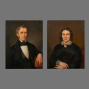 Paar pendantportretten van een echtpaar, olieverf op doek, niet gesigneerd, midden 19e eeuw -restauraties, stukjes van de lijst bijgevoegd-, 72 × 56 cm