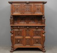Rijk geornamenteerde eiken zevendeurs buffetkast, voorzien van mascarons, schilddragende leeuwen, briefpanelen en atlanten, neorenaissance, 210 × 150 × 62 cm