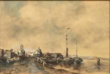 Johan Conrad Greive (1837-1891), landschap met stad, gemengde techniek op papier, l.o. gesigneerd -vlekjes-, 24 × 35 cm