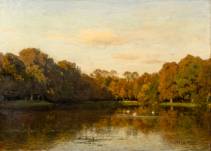 Julius Jacobus van de Sande Bakhuyzen (1835-1925), wandelaars langs de oever van een vijver, olieverf op doek, r.o. gesigneerd, 53 × 72 cm