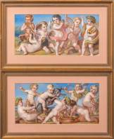 Europese School, paar schilderijen: musicerende putti en faun, met centraal een cherubijn die dwarsfluit speelt, en: putti bij een druiventon, die een bokje plagen, beide olieverf op board, niet gesigneerd, 20e eeuw, uniform ingelijst -één schilderij rechtsboven klein defect-, 23 × 47 cm