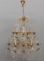 Twaalflichts smeedijzeren kroonluchter met glazen pegels en stam -gebruikssporen-, 110 × Ø 90 cm