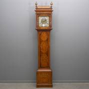Engels staand horloge in wortelnoten kast met marqueterie van bloemen en vogels, de kap voorzien van ajourgezaagd rankendecor, de vierkante messing wijzerplaat met verzilverde cijferring, verguld metalen hoekstukken, seconde-, minuut-, uur-, datumaanduiding, rondom de datumaanduiding gegraveerd decor van oorlogsattributen, gesigneerd: G. Somersall, Londen, 18e eeuw -kast samengesteld-, 227 × 45 × 26 cm