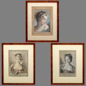 Louis-Marin Bonnet (1736-1793), twee vrouwenportretten, naar Boucher, kleurenetsen, en Giles Demarteau (1722-1766), vrouwenportret, naar Boucher, kleurenets -vlekken-, 29,5 × 21,5 cm, daarbij het boek: J. Adhémar 'La Gravure'