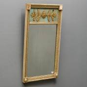 Spiegel in lichtgrijze houten lijst met parel- en kabelranden, en bovenin een bladmotief, eind 18e eeuw -defecten aan ornamenten-, 75 × 38,5 cm