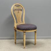 Wit- en blauwgelakt stoeltje, de rugleuning met gesneden luchtballonvormig ornament en gemonogrammeerde M, naar de gebroeders Montegolfier, pioniers op het gebied van de ballonvaart, Louis Seize-stijl, Frankrijk, hedendaags, 100 × 45 × 50 cm