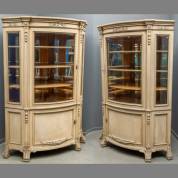 Paar crèmewitgelakte hoekvitrinekasten met gefacetteerd glas, aan de binnenkant voorzien van spiegels, Louis Seize-stijl, eind 19e/begin 20e eeuw, 210 × 110 × 110 cm