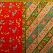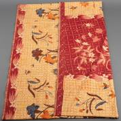 Cotton batik tulis sarong, the central part with flowers on red background, the small part with flowers in diagonal stripes on green, blue and striped background, stamped twice with studio stamp, not clearly readable, Pekalongan, Java, Indonesia, circa 1930 -little bit dingy-, 164 × 102 cm Katoenen batik tulis sarong, het centrale deel met bloemen op rood fond, het kleinere deel met bloemen in horizontale strepen op groen, blauw en gestreept fond, tweemaal gestempeld maar onduidelijk leesbaar, Pekalongan, Java, Indonesië, circa 1930 -klein beetje smoezelig-, 164 × 102 cm