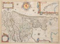 Ingekleurde gravure: kaart van de Nederlanden, Noordzee en Waddeneilanden, 'Hollandia comitatus', Willem Janszoon Blaeu, 17e eeuw, 39 × 53 cm