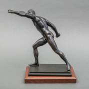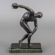Bronzen beeld: discuswerper, op groen natuurstenen basement, gemerkt voor bronsgieterij Gladenbeck, Berlijn, hoogte inclusief basement 33 cm