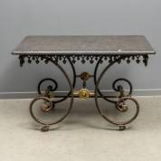 Metalen bakkers- of slagerstafel met natuurstenen blad, het onderstel met messing verbindingsdelen, het geheel op faux wieltjes, Frankrijk, tweede helft 20e eeuw, 74 × 63 × 116 cm