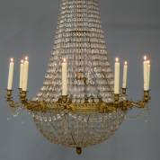 Verguld messing tienlichts kaarsenkroon met kristallen pegels, de kaarshouders gedragen door zwanen, 19e eeuw, het middendeel met elektrische verlichting van later datum, 120 × Ø 90 cm