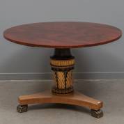 Salontafel met bloemmahonie blad, de poot met goudkleurige acanthusbladeren en parelrand, op driespantpoot met klauwpoten, empire-stijl -poot licht verkleurd-, 61 × Ø 92 cm