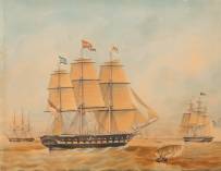 Jacob Spin (1806-1875), scheepsportret van het fregat 'Rhoon en Pendrecht', kapitein Fokko Fokkens van de rederij A. van Hoboken & Zoon, Rotterdam, rechts vaart het schip de 'Rotterdam', van kapitein Pieter Vis van dezelfde rederij, aquarel, l.o. gesigneerd en gedateerd 1844 -gebruind-, 49 × 63 cm