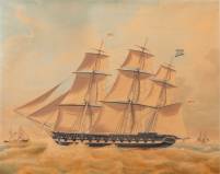 Jacob Spin (1806-1875), scheepsportret van het fregat 'Menado', kapitein Fokko Fokkens van rederij A. van Hoboken & Zoon, Rotterdam, aquarel, l.o. gesigneerd en gedateerd 1843 -gebruind-, 47 × 59 cm