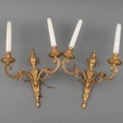 Paar verguld bronzen tweelichts geëlektrificeerde appliques met vaasvormig ornament en ramskop, de fittingen in kaarsvormig omhulsel van was, 19e/begin 20e eeuw, 44 × 29 × 14 cm