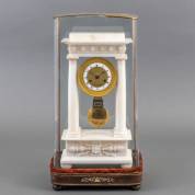 Wit marmeren kolompendule met verguld bronzen wijzerplaat en witgeëmailleerde cijferring, eerste helft 19e eeuw -enkele defecten-, 43 × 22 × 13 cm, onder stolp -barst-