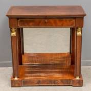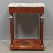 Mahoniegefineerde trumeau met marmeren blad, gedragen door kariatiden, empire-stijl -chips uit marmeren blad, vochtkring in fineer-, 80 × 63 × 35 cm