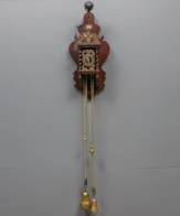 Zaanse stoelklok met getorste zuiltjes de gegoten belhekken in de vorm van Geloof, Hoop en Liefde, aan de zijkanten met leeuwen die het stadswapen van Amsterdam vasthouden en onderschrift 'nu elck syn sin', de wijzerplaat met inscriptie: D. Engel, West-Zaan, klokkenmaker Dirk Thijszoon Engel (1668-1733) -defecten, gebruikssporen, enkele missende onderdelen, gewichten mogelijk niet origineel-, 76 × 40 × 22 cm