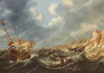 Hollandse School: schepen in een storm nabij een rotsachtige kust, in de trant van Adam Willaerts (1577-1664), olieverf op doek, eerste helft 17e eeuw -restauraties en inschilderingen-, 99 × 140 cm