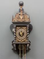 Zaanse stoelklok in gezwart houten kast, met messing wijzerplaat en Romeinse cijfers, gesigneerd J. Pelt, Zaandam, op fluwelen achterplaat met gegoten hoekstukken en bloemguirlande, voorzien van wekkerwerk, dubbele bel bekroond door Atlas, en verguld metalen belhekken met decor van Geloof, Hoop en Liefde, inclusief vier gewichten, vermoedelijk 18e eeuw met latere elementen, 79 × 33 × 22 cm