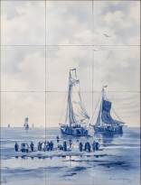Delfts aardewerk twaalfpas tegeltableau met blauw-wit decor: het uitladen van de vangst, naar H.W. Mesdag, schilder H.C. Bottelier, uitvoering De Porceleyne Fles, Delft, circa 1900, 80,5 × 60 cm