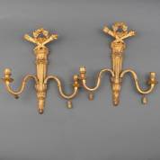 Paar verguld houten tweearmige wandkandelaars, met decor van strik, pijlen en bloemen en twee pampels, Louis Seize-stijl -kleine defecten-, 44 × 40 cm