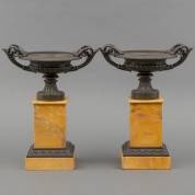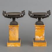 Paar bronzen tazza's op Sienamarmeren basementen, 19e eeuw -chipjes onderaan-, 31 × 25 × 17 cm