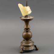 Bronzen penkandelaar met balustervormige stam en staande op drie pootjes, 17e eeuw -restauraties aan voetrand-, hoogte 35 cm