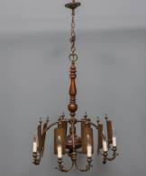 Achtlichts houten en messing kroonluchter met messing reflectoren bij de lichtbronnen, begin 20e eeuw, 77 × 57 cm